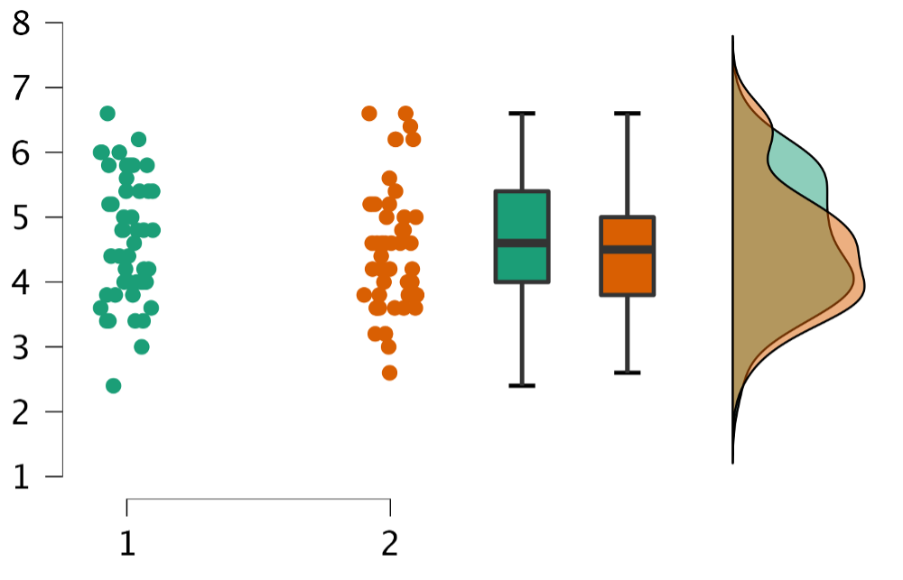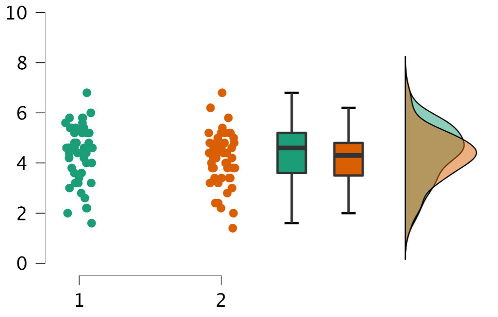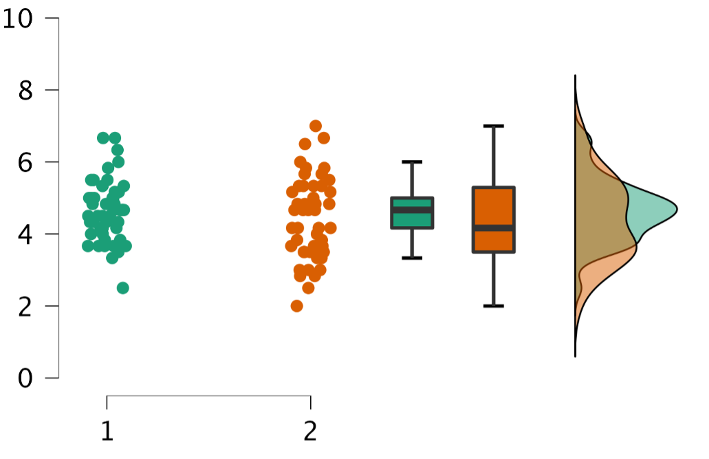 Apart from the mean comparison, to further explore the real influence of the intervention, raincloud plots were employed to observe the distinction between data distributions. Figure 1 displays the raincloud plot of the Enjoyment score, with green representing the Experiment group and orange representing the Control group. From this figure, we could conclude that, although the means between the two groups are not significantly different, the Experiment group has a more clustered distribution. It means that more students belong to the high-achieving half. To compare, although the Control group has a similar mean, more students belong to the low-achieving group. Interestingly, the Control group harbours more top students at the end of the intervention. It may be because the intervention is not masked, which galvanises some students in the Control group out of the sense of competition, which needs to be analysed in future.