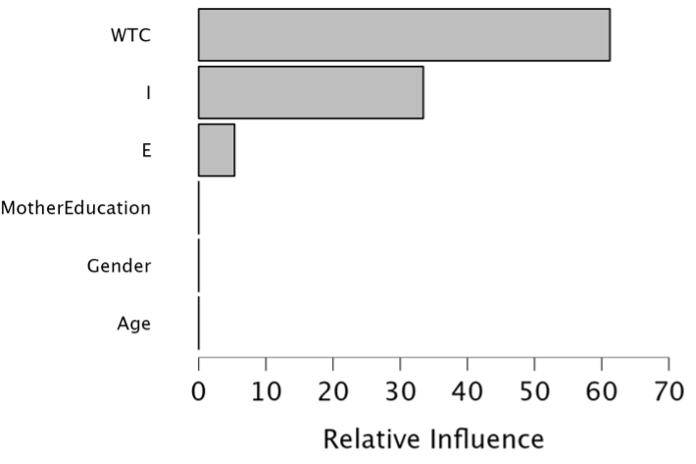 To complement the low statistical power, a machine learning model (boosting regression) was developed to successively enter information into a decision tree ensemble which in the end fit the data to the residual distributions (JASP Team, 2020). Table 5 and Figure 5 shows the summary statistics and relative influence of the entered variable on post-test.