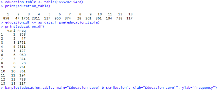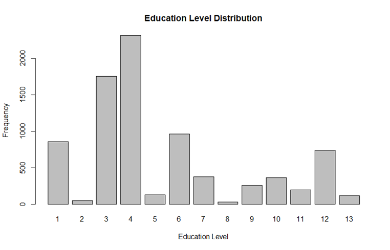 My analysis focused on the comprehensive 2021 CGSS dataset, which encompasses survey responses from more than 8,000 individuals throughout China. This dataset is rich with approximately 700 variables, offering a broad spectrum of insights. Demographically, the sample exhibits a balanced gender representation with 45% male and 55% female respondents. Educational background was assessed on a 13-point scale, with the average participant education level aligning with high school completion (level 5). However, as will be subsequently discussed (Figure 1), the dataset reveals significant variation in educational attainment among participants.