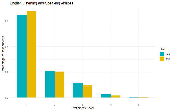 Respondents assessed their English listening (A51) and speaking (A52) proficiencies using a 1-to-5 scale, excluding responses such as 'I don't know' and 'refuse to answer' (see Figure 2 below). Descriptive analysis revealed an average listening score of 1.65 and a standard deviation of 0.33. The mean speaking score was marginally lower at 1.55, coupled with a smaller standard deviation, indicating less variability in speaking ability reports. The chart demonstrates that at Level 1 Proficiency, a notable number of participants self-report minimal listening and speaking abilities, with listening slightly ahead. At Level 2 Proficiency, a considerable percentage acknowledges moderate comprehension and conversational skills in English, with a leaning towards listening. As proficiency ascends from Levels 3 to 5, there is a discernible decline in self-assessment, revealing a concentration of lower-level proficiencies amongst respondents. Evaluating listening against speaking across the spectrum, it emerges that respondents consistently claim better understanding than expressive language skills. This pattern aligns with typical trends in linguistic development.