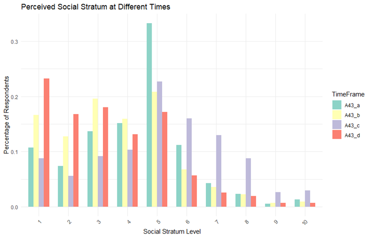 The data reveals a notable clustering of individuals identifying with the central social tiers (levels 4 and 5). A retrospective view uncovers a modest positioning in the past decade, with the majority aligning themselves with the lower-middle strata (levels 3 and 4). Forward-looking expectations indicate an upward aspirational trend, with a peak at level 6. Furthermore, reflections on family status during early adolescence (age 14) indicate a prevalent association with the lower echelons of the social hierarchy, primarily levels 2 and 3.