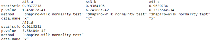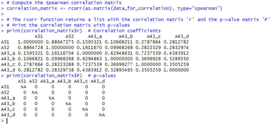 Before choosing the proper test, normality was tested. Deviations from the expected diagonal in all four Q-Q plots, especially in the tails, suggest distributions with heavier tails than normal. Shapiro-Wilk test results, with p-values near zero, reject normality well below the 0.05 significance threshold. These findings justify using non-parametric methods like Spearman's correlation for further analysis.