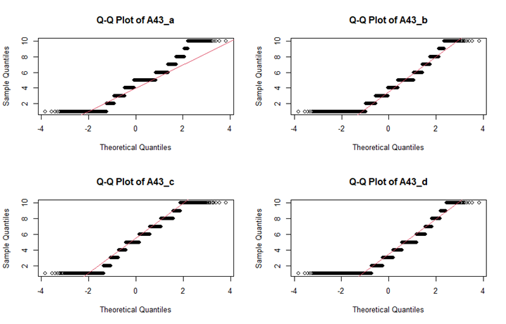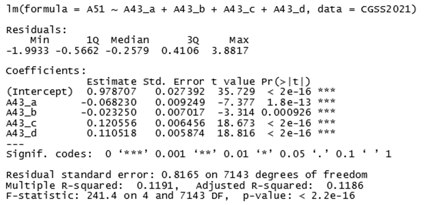 The model's residual standard error is 0.8165, suggesting a moderate fit given that A51 ranges from 1 to 5. With an R-squared value of 0.1191, the model explains nearly 12% of the variance in listening proficiency, indicating significant unaccounted factors. The adjusted R-squared, at 0.1186, implies an efficient number of predictors relative to the sample size. The F-statistic of 241.4 with a negligible p-value strongly supports the model's significance. Contrasting coefficient signs reveal nuanced relationships: negative for A43_a and A43_b, questioning whether higher current or past social status aligns with better listening skills. Conversely, positive values for A43_c and A43_d correspond with anticipated societal standing and familial background, aligning with expectations that these factors contribute positively to listening proficiency. These dynamics underscore the complex interplay between social status and language skills and may reflect underlying educational or experiential differences or potential measurement biases in social status assessment.